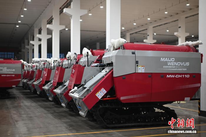 2025年12月,威马农机的工厂内,联合收割机已“打包”好,将出口东南亚。张旭 摄